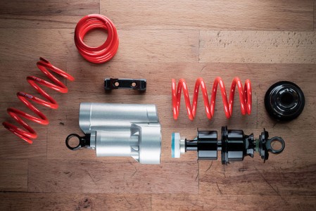 Амортизатор оснащений універсальною спіральною пружиною із зусиллям 135 фунтів на дюйм, доповненою регульованою повітряною пружиною, яка також нагнітає тиск в амортизаційну рідину. Пневматична пружина вимагає мінімального тиску в 200 фунтів на квадратний дюйм для забезпечення стабільного демпфірування, встановлюючи нижній поріг ваги в 85 кг для гонщиків. Легші люди можуть зіткнутися з проблемою досягнення досить м’якої комбінованої швидкості пружини при збереженні необхідного тиску демпфірування.